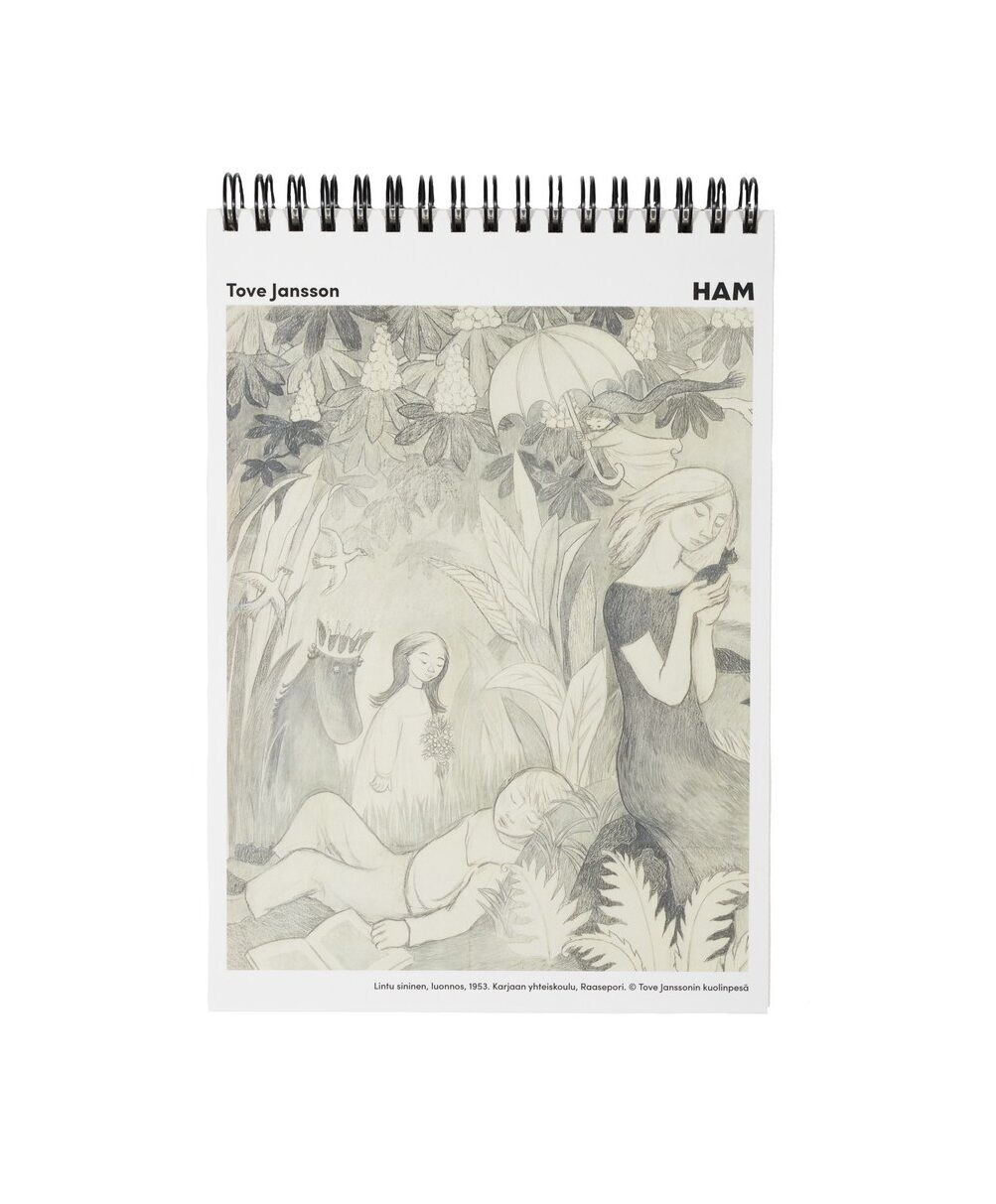 A5 kokoinen luonnoslehtiö. Kuvassa luonnos Tove Janssonin maalaamasta teoksesta Lintu sininen.